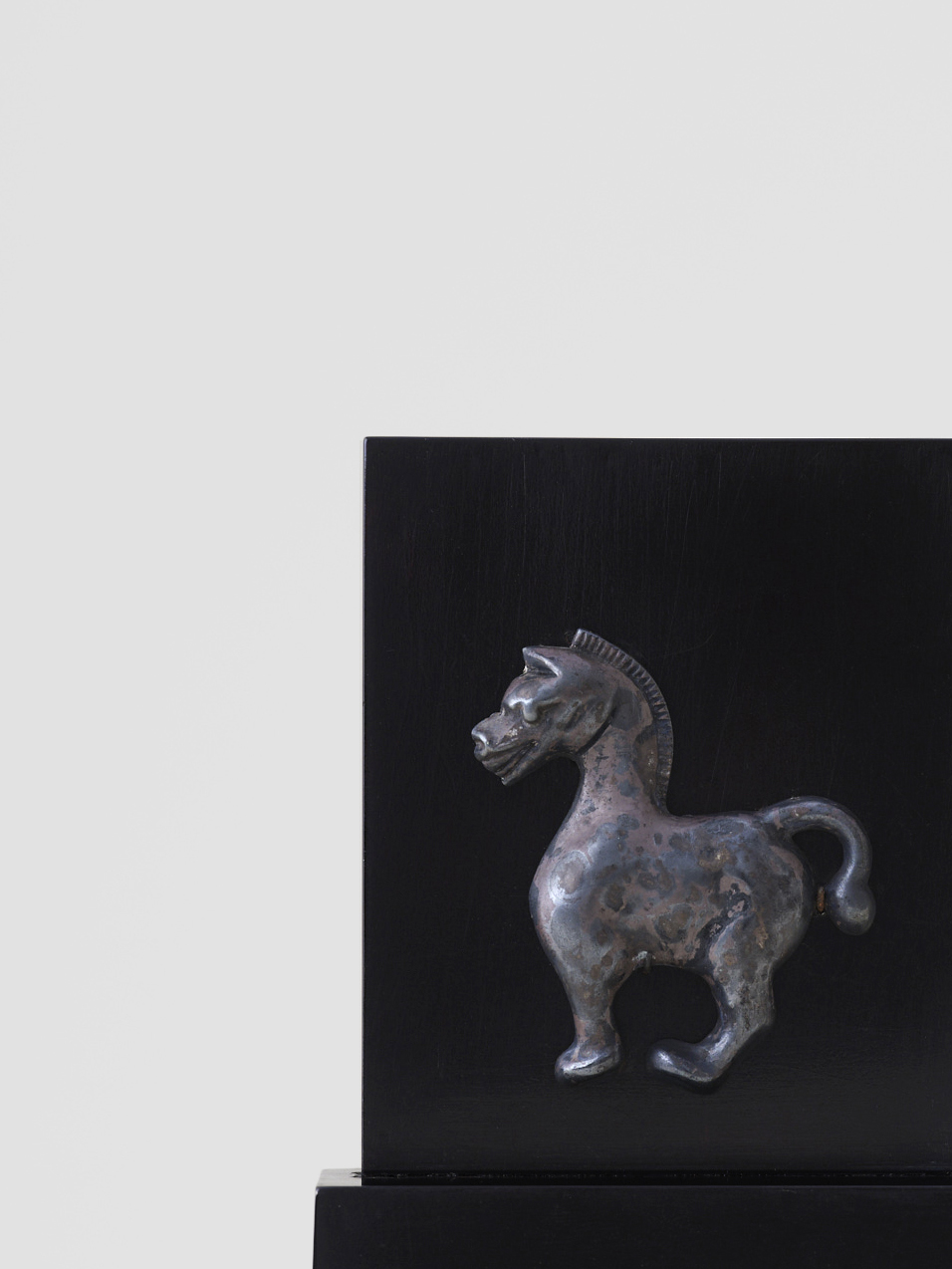 銀製、馬型の装飾板。鎚鍱(薄い銀板を型にあて槌でたたき出した)の技法により形造り、毛彫によりたてがみを表現していると思われます。 塗りの木製台座。壺中居の仕込箱に納まります。